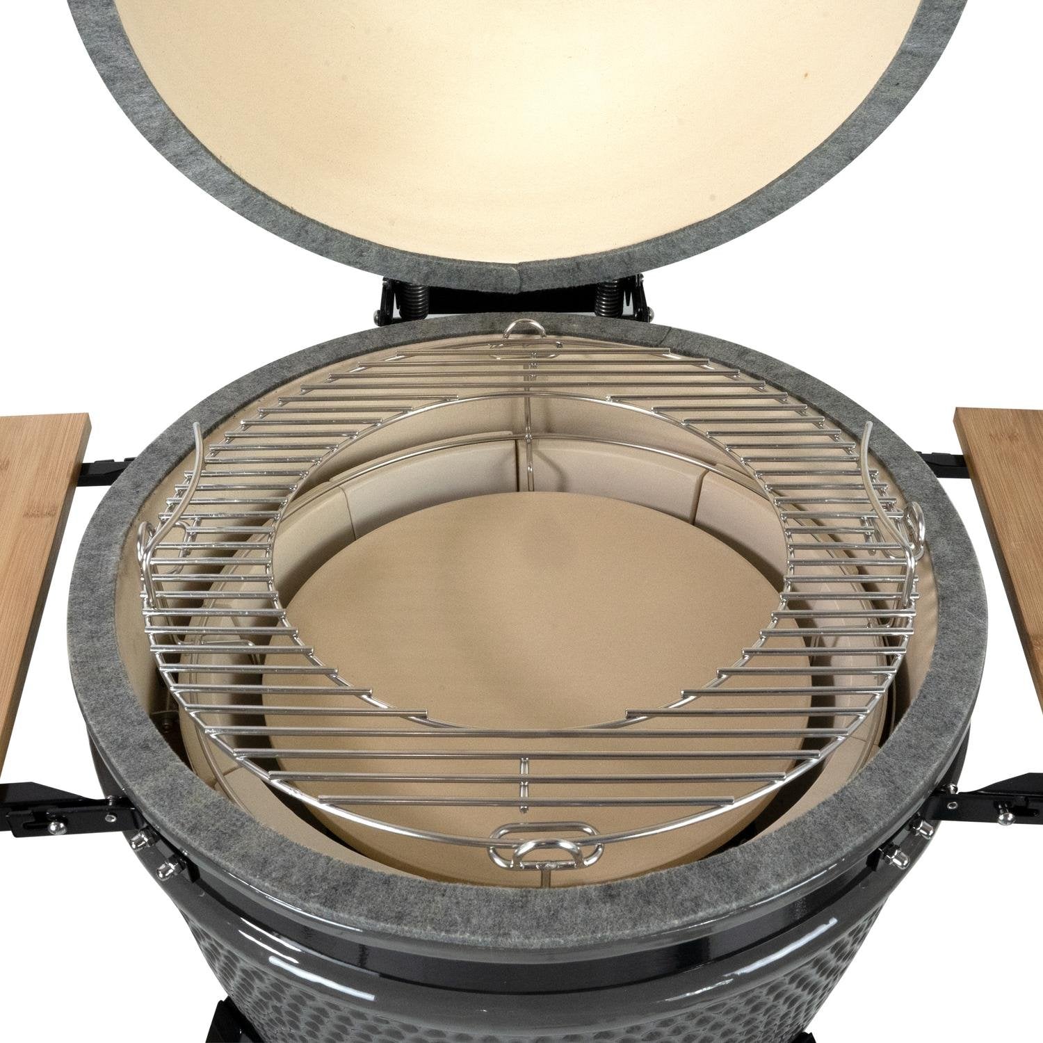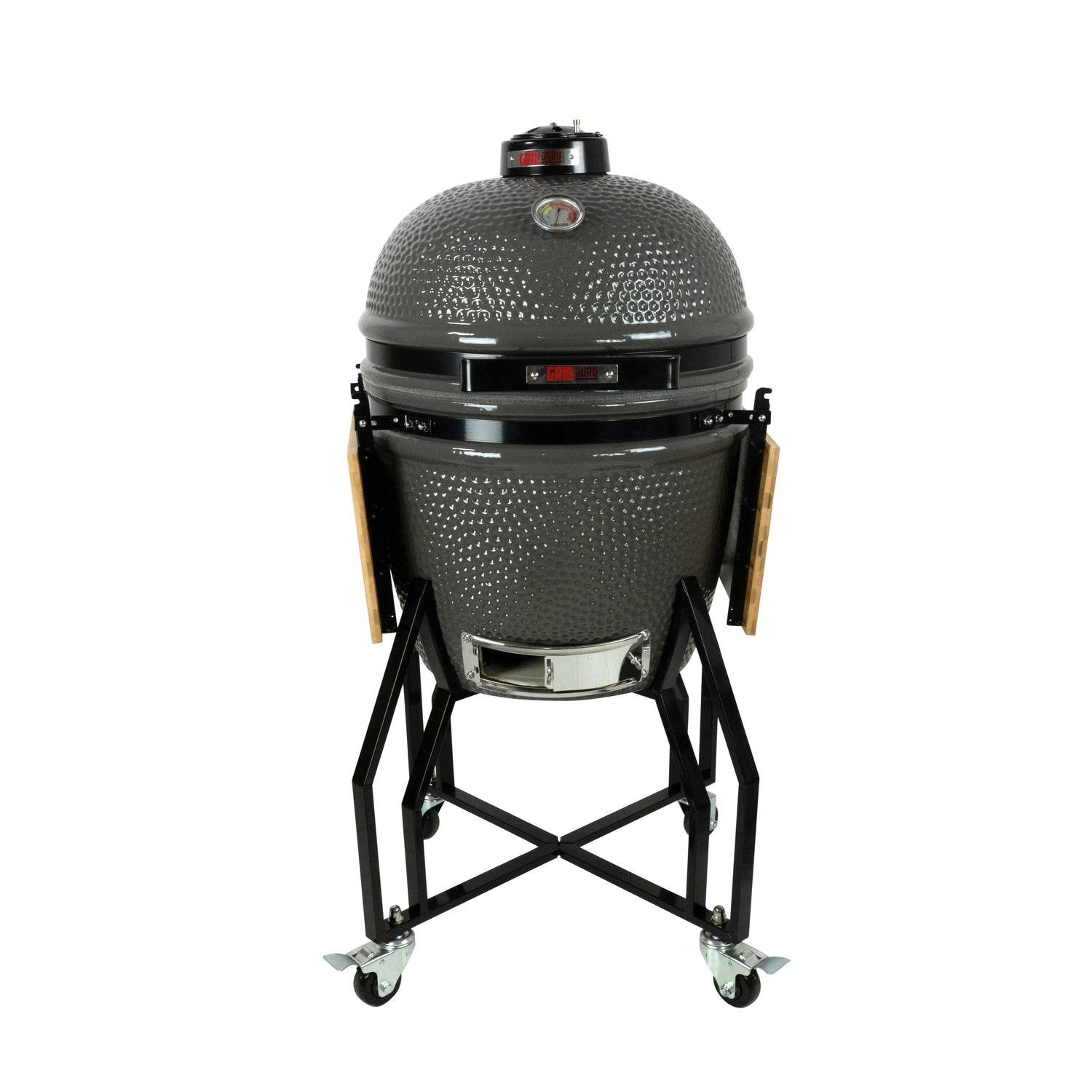 De Grill Guru Original Large is al jaren de bestseller in de Grill Guru range. Deze kamado is gemaakt van hoogwaardig keramiek en zeer compleet met Plate Setter, regenhoes en as pook. Dankzij het Flip Grid systeem, is de Original Large te combineren met de Flip Grid accessoires. Hiermee kunnen verschillende kooktechnieken worden toegpast. Bak pizza’s, grill groenten of rook vis; met deze BBQ kan het allemaal. De Grill Guru Original Large wordt geleverd met onderstel en handige inklapbare zijtafels van bamboe. THE SPECS: - Powder-coated Topcap. - Roestvrij stalen grillrooster van ø 47 cm. - Handige thermometer voor roken, grillen en bakken. - Vernieuwde Firebox met losse tegels. - Powder-coated frame op zwenkwielen, waarvan 2 met rem. - Twee handige inklapbare bamboe zijtafels. - Compleet met Plate Setter, regenhoes, as pook en Flip Grid grill. - Hoogte inclusief chassis: 122 cm. - Inclusief 20 jaar garantie op de keramische buitenschaal van Grill Guru. - Gemakkelijk uit te breiden met de vele Grill Guru accessoires.